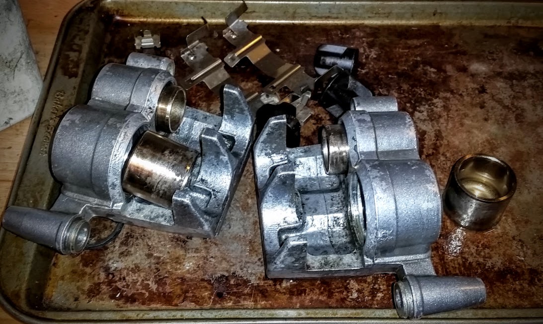 The front calipers are cleaned up and blown apart, waiting for their rebuilds, probably later this week.